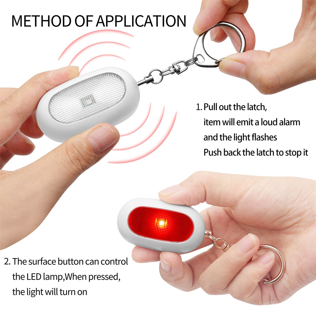 2. Pull out the latch, item will emit a loud alarm and the light flashes. Push back the latch to stop it. In case of an emergency, a loud alarm can attract the attention of others and give you timely help.
